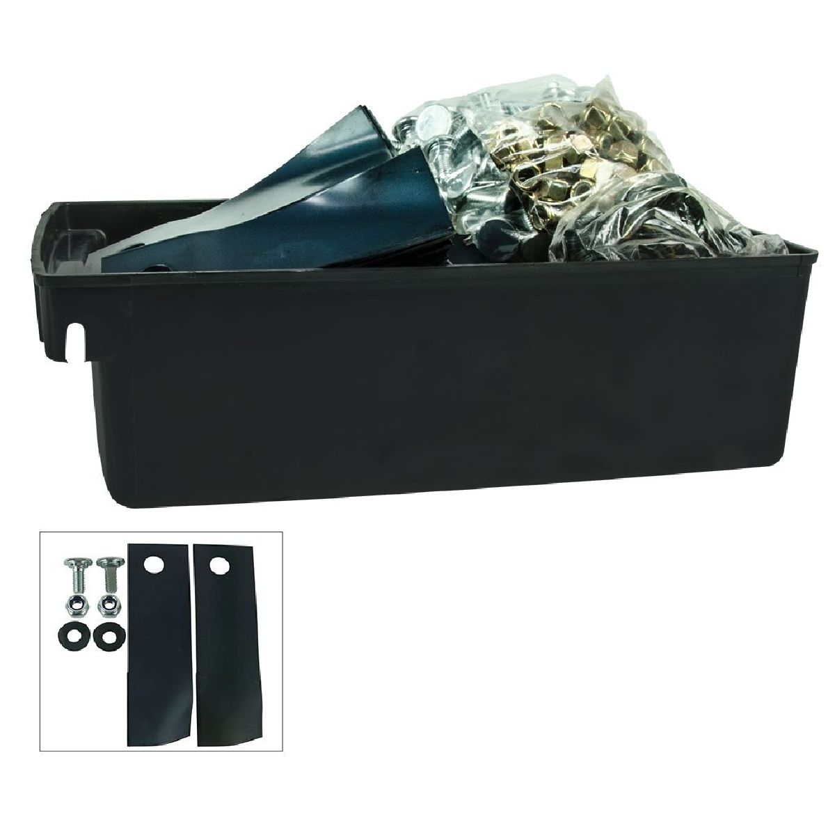 | Features: | Stepped & high fluted catching blades with offset bolt hole comes with matching bolt sets, supplied in bulk for workshop use in a reusable plastic parts box. |
